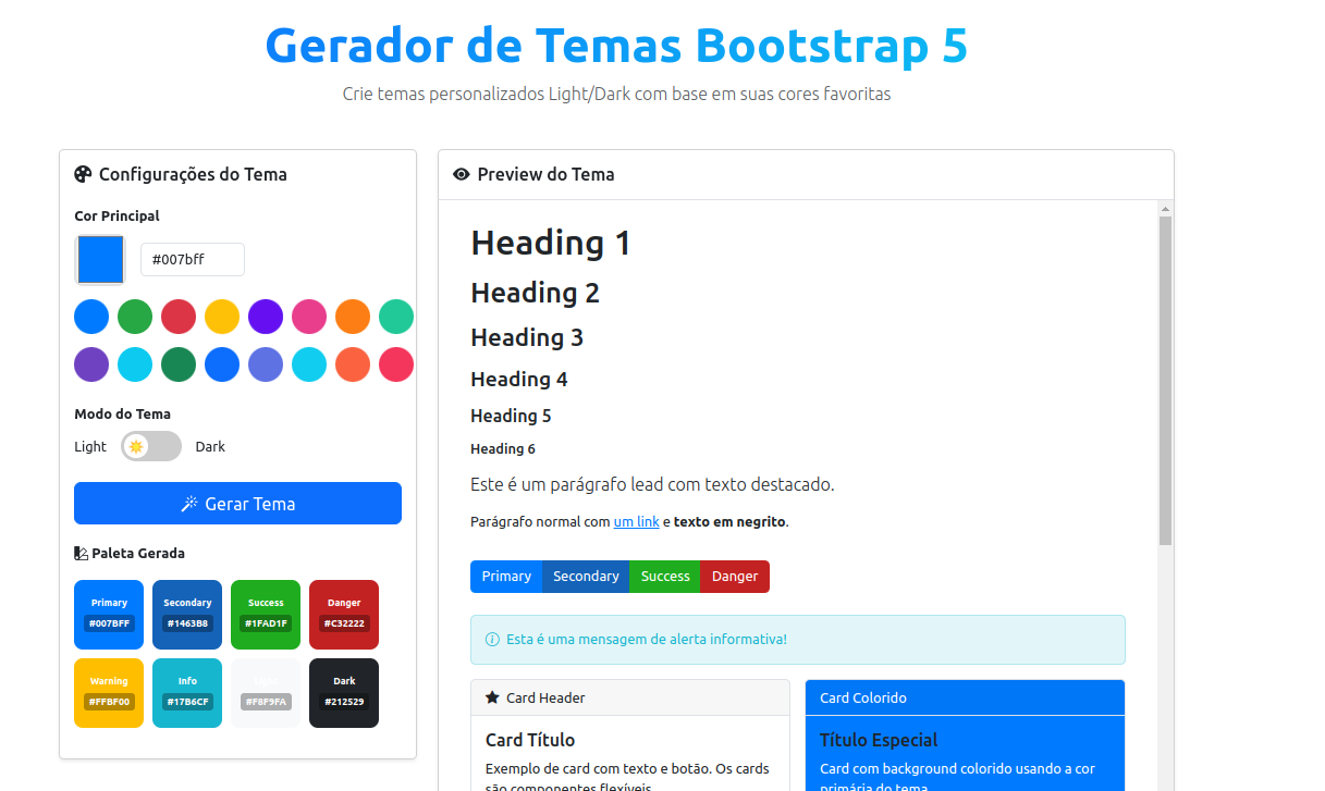 Gerador de Temas é uma ferramenta poderosa projetada para criar temas personalizados para o framework #Bootstrap5, permitindo aos desenvolvedores adaptar rapidamente cores, fontes, espaçamentos e componentes visuais sem codificação manual complexa.